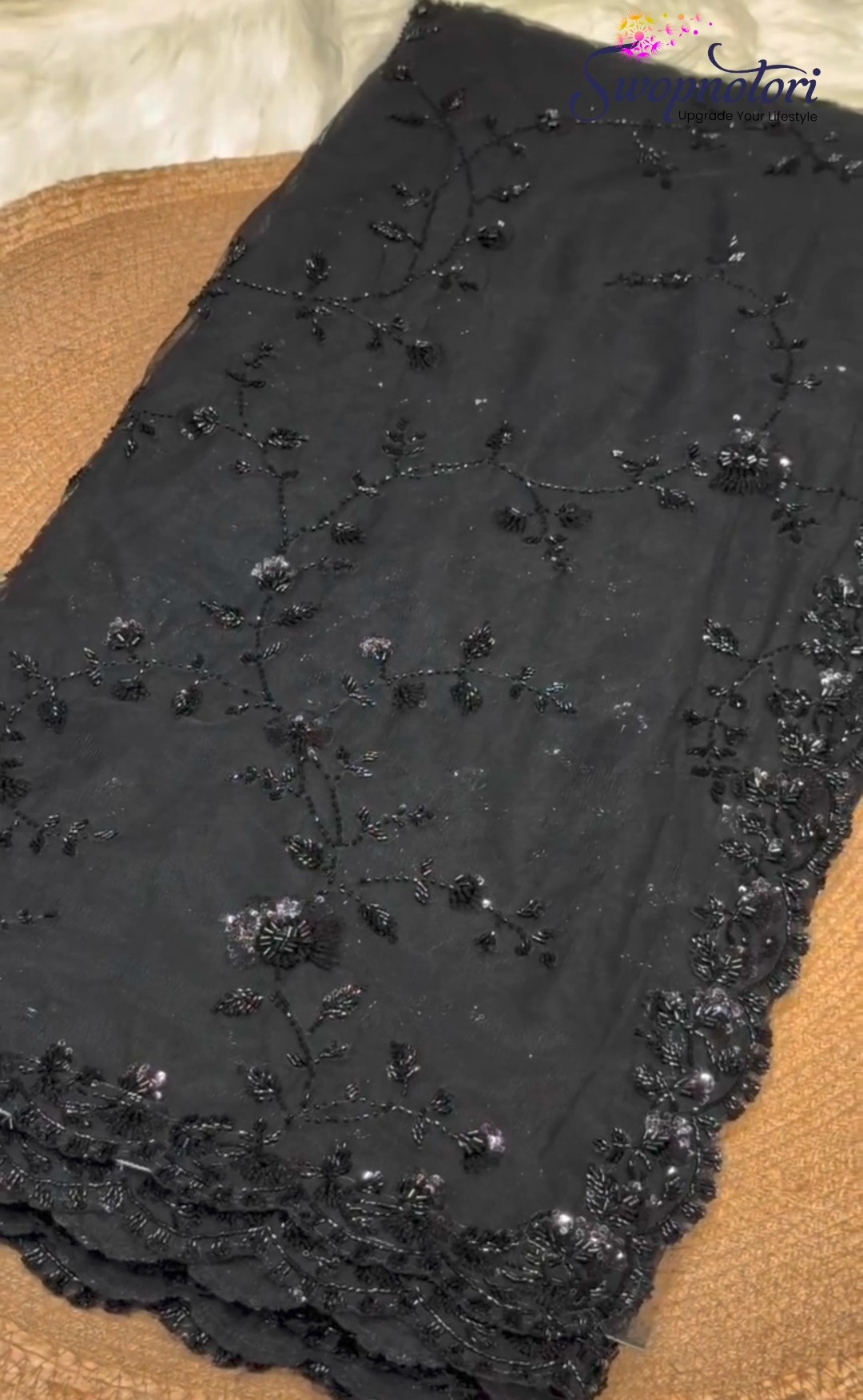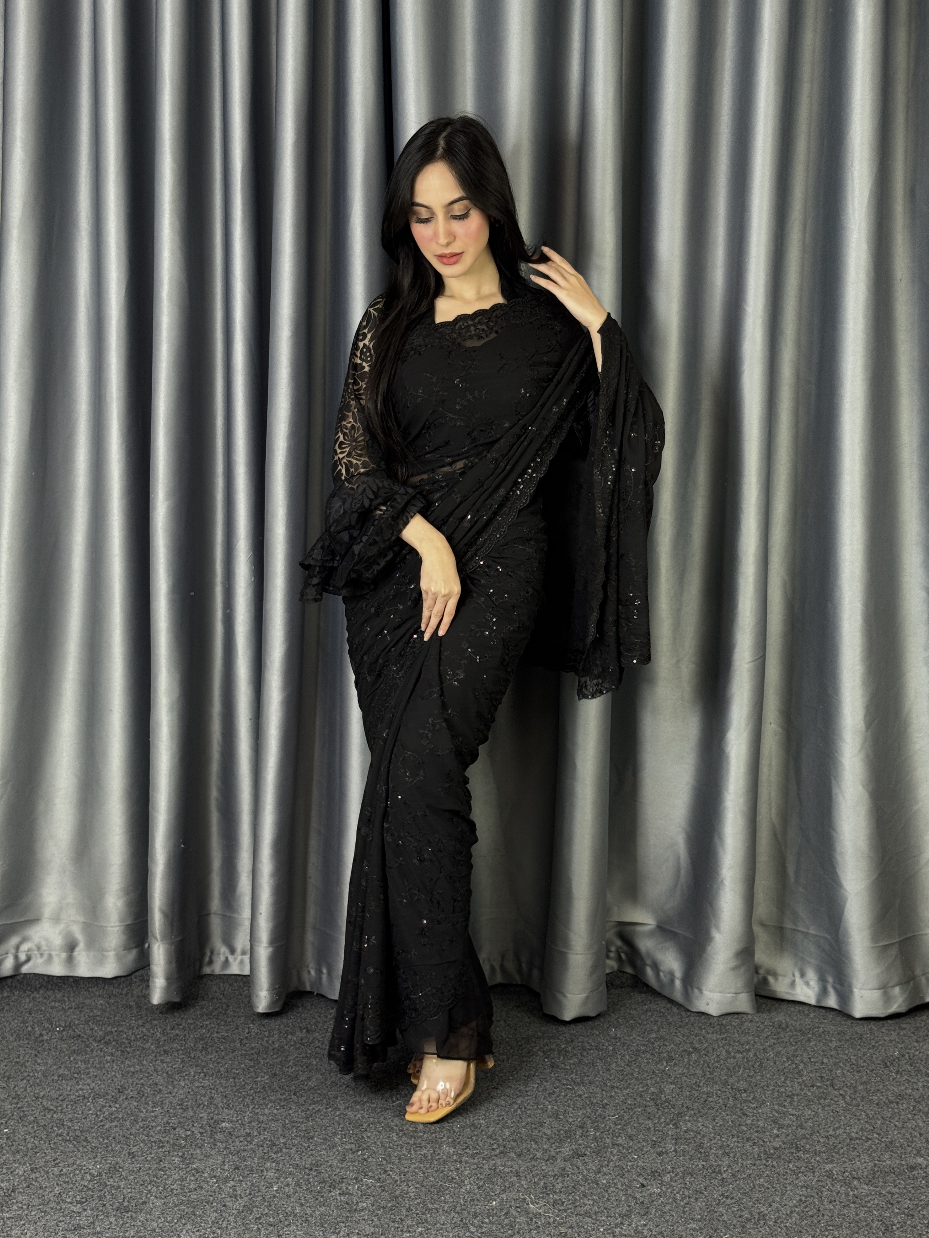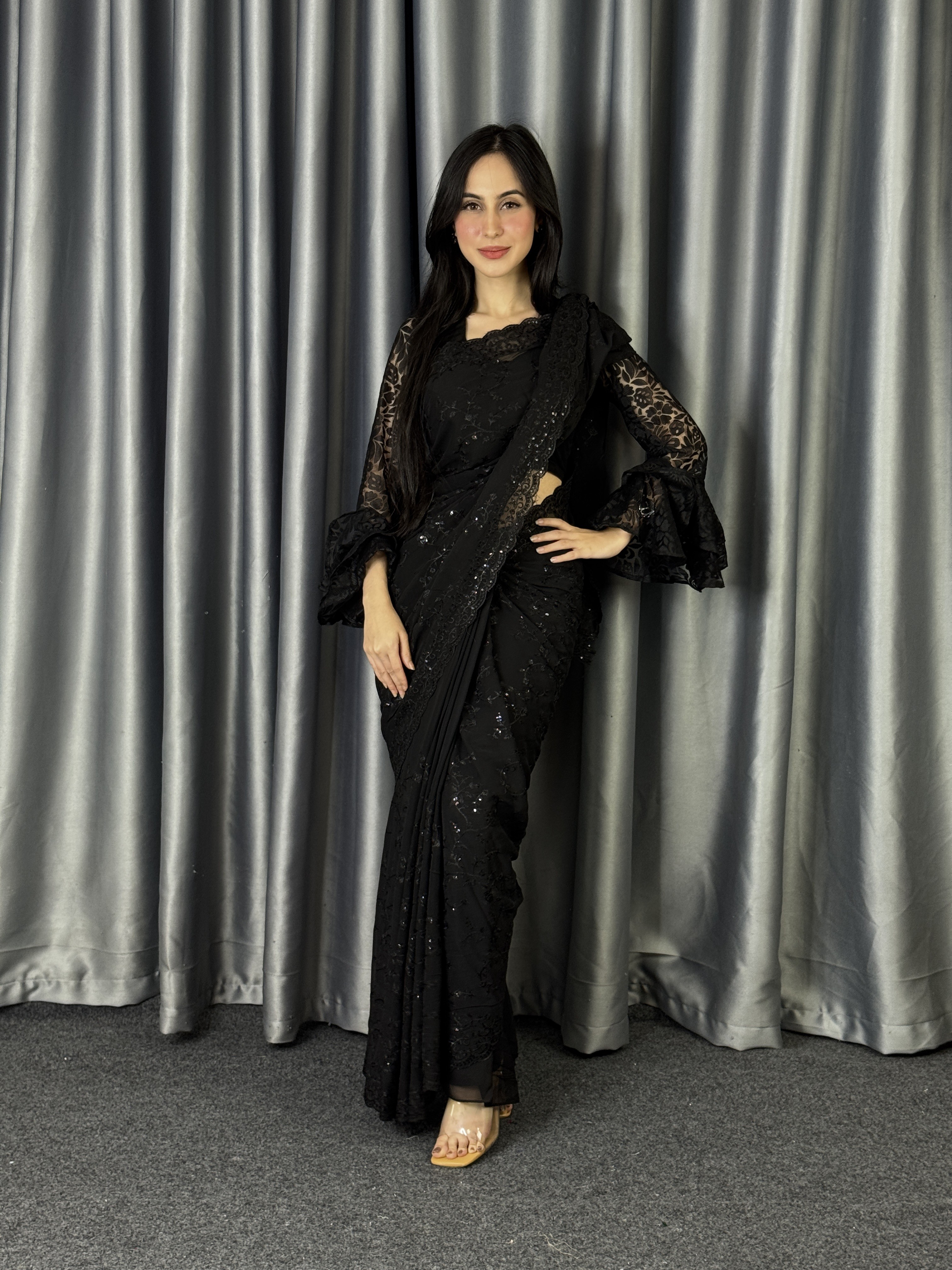 The elegance of black paired with shimmering sequences makes this piece truly timeless — perfect for weddings, parties, or any grand occasion.